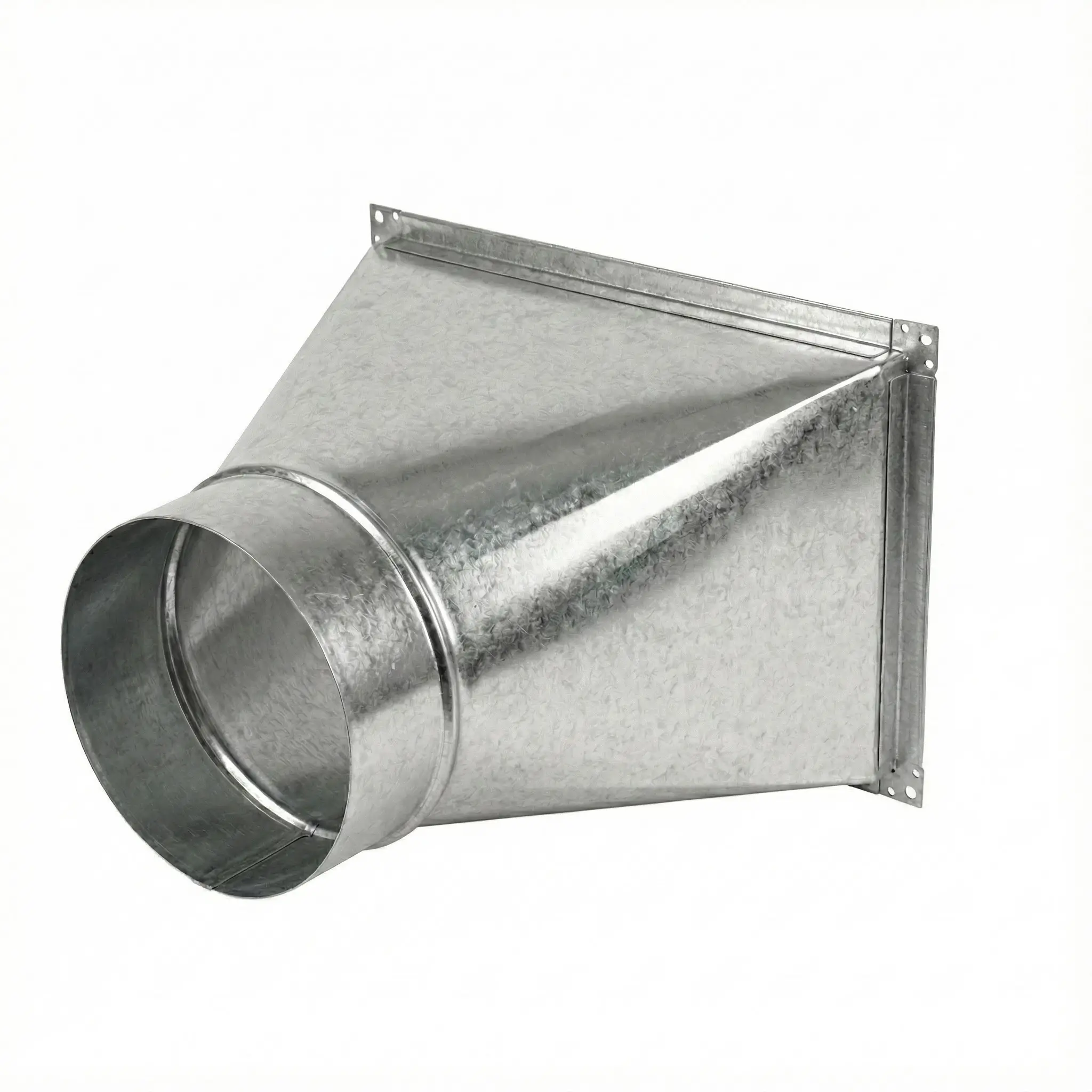 Переход прямоугольное сечение на круглое применяется для соединения участков вентиляционной сети различной формы. Изделие обеспечивает герметичную стыковку прямоугольного воздуховода с круглым каналом без утечек воздуха и с сохранением проектной геометрии трассы.
